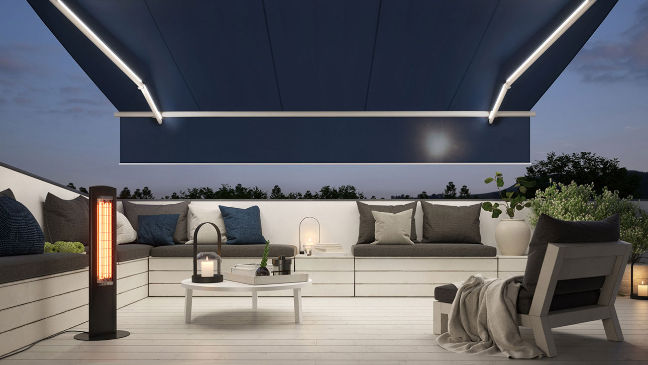 Ästhetisch und formschön präsentiert sich die markilux MX-4 mit geschlossener Kassette und umlaufender Sichtblende. Komponiert für die Beschattung großer Flächen, überzeugt sie mit ihrer avantgardistischen Gestaltung und innovativen Beleuchtungsoptionen.